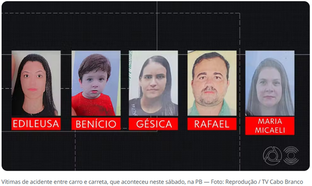 Entre os mortos estão pai, mãe e filho. A criança foi identificada como Benício Ferreira Ribeiro, de dois anos, filho do condutor do veículo, Rafael Ribeiro Almeida, de 40 anos. Ele viajava com a esposa, Maria Micaeli Alves Ferreira, de 42 anos. Todos eram naturais do Ceará.