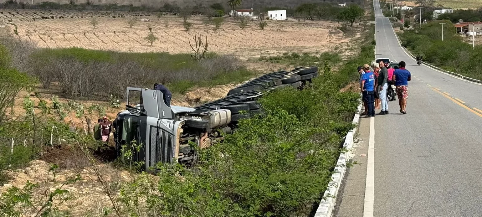Carreta tomba na PB-137, próximo a Baraúna, e motorista é socorrido sem ferimentos graves