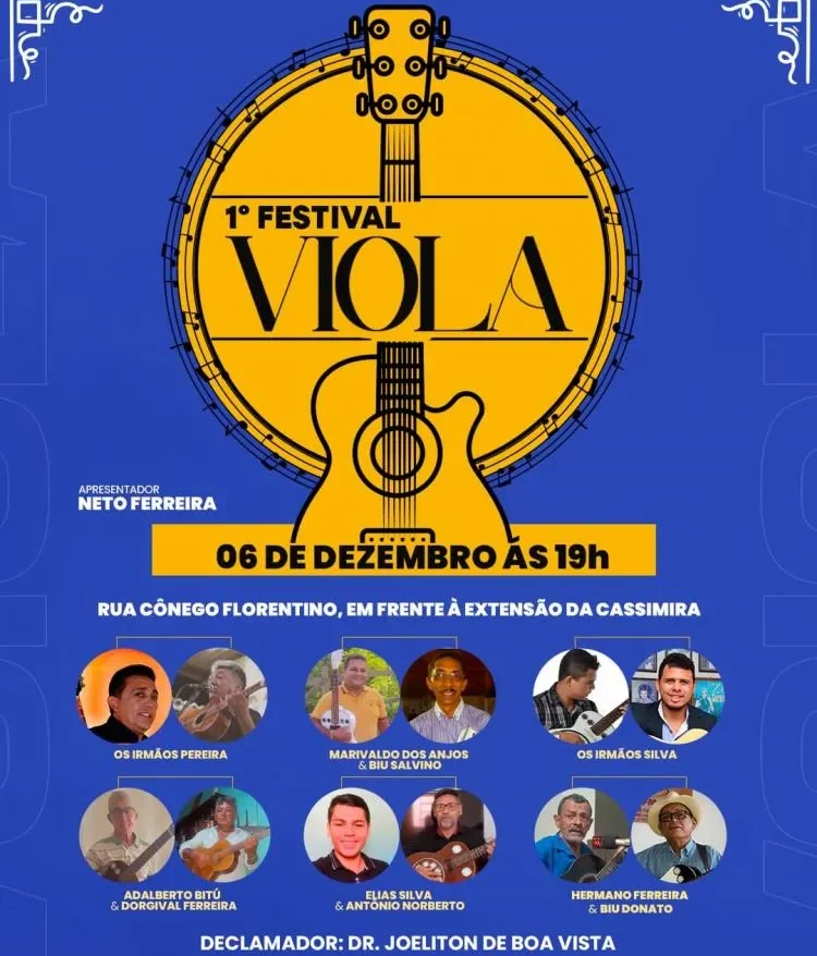 Com apresentação de Neto Ferreira, o festival reunirá grandes nomes da viola, como Os Irmãos Pereira, Marivaldo dos Anjos & Salvino, Os Irmãos Silva, Adalberto Bitú & Dorgival Ferreira, Elias Silva & Antônio Norberto, além de Hermano Ferreira & Biu Donato. O evento também contará com a presença especial do declamador Dr. Joeliton de Boa Vista, trazendo poesia e emoção ao público.
