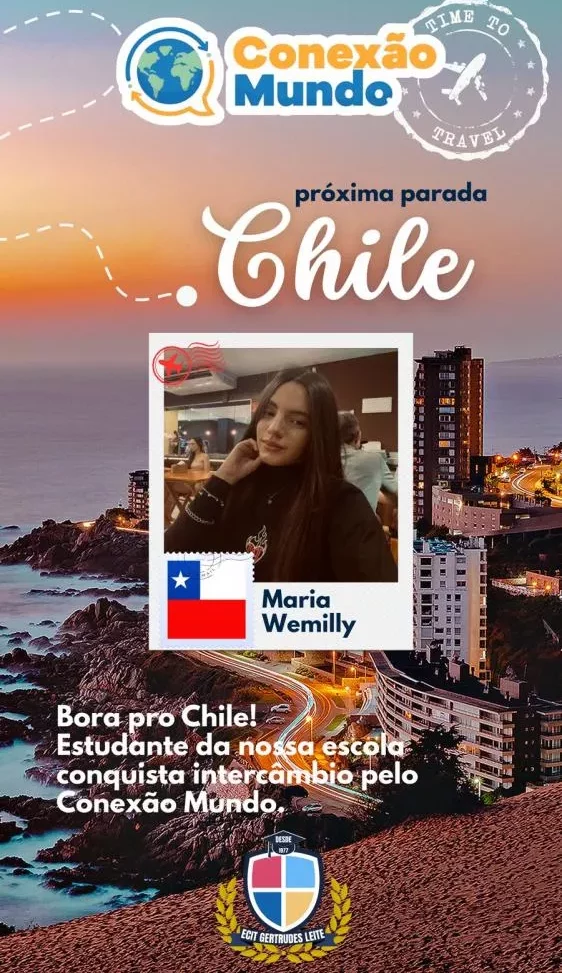 A Escola Cidadã Integral Técnica (ECIT) Gertrudes Leite anunciou, com orgulho, que a estudante Maria Wemilly foi selecionada para participar do programa de intercâmbio internacional Conexão Mundo, que terá como destino o Chile.