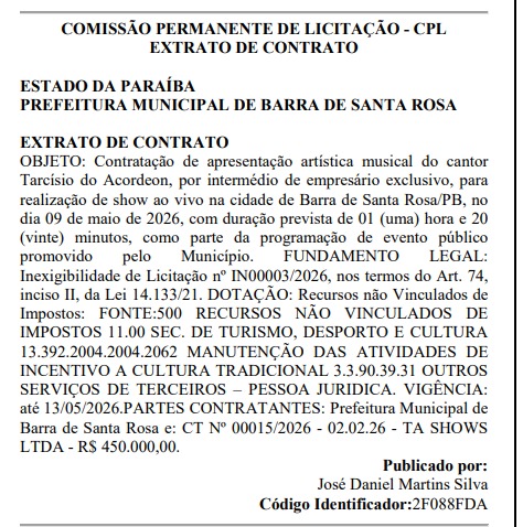 A Prefeitura de Barra de Santa Rosa, no Curimataú da Paraíba, desembolsará R$ 450 mil para a contratação do cantor Tarcísio do Acordeon. O extrato do contrato foi publicado no Diário Oficial dos Municípios nesta quarta-feira (11).