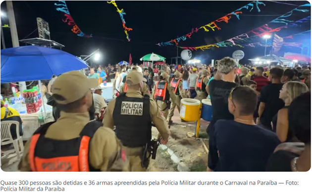 Quase 300 pessoas foram detidas e 36 armas de fogo foram apreendidas pela Polícia Militar durante o policiamento em eventos de carnaval na Paraíba, entre a sexta-feira (13) e as últimas horas da terça-feira (17). As informações foram confirmadas pela própria corporação.