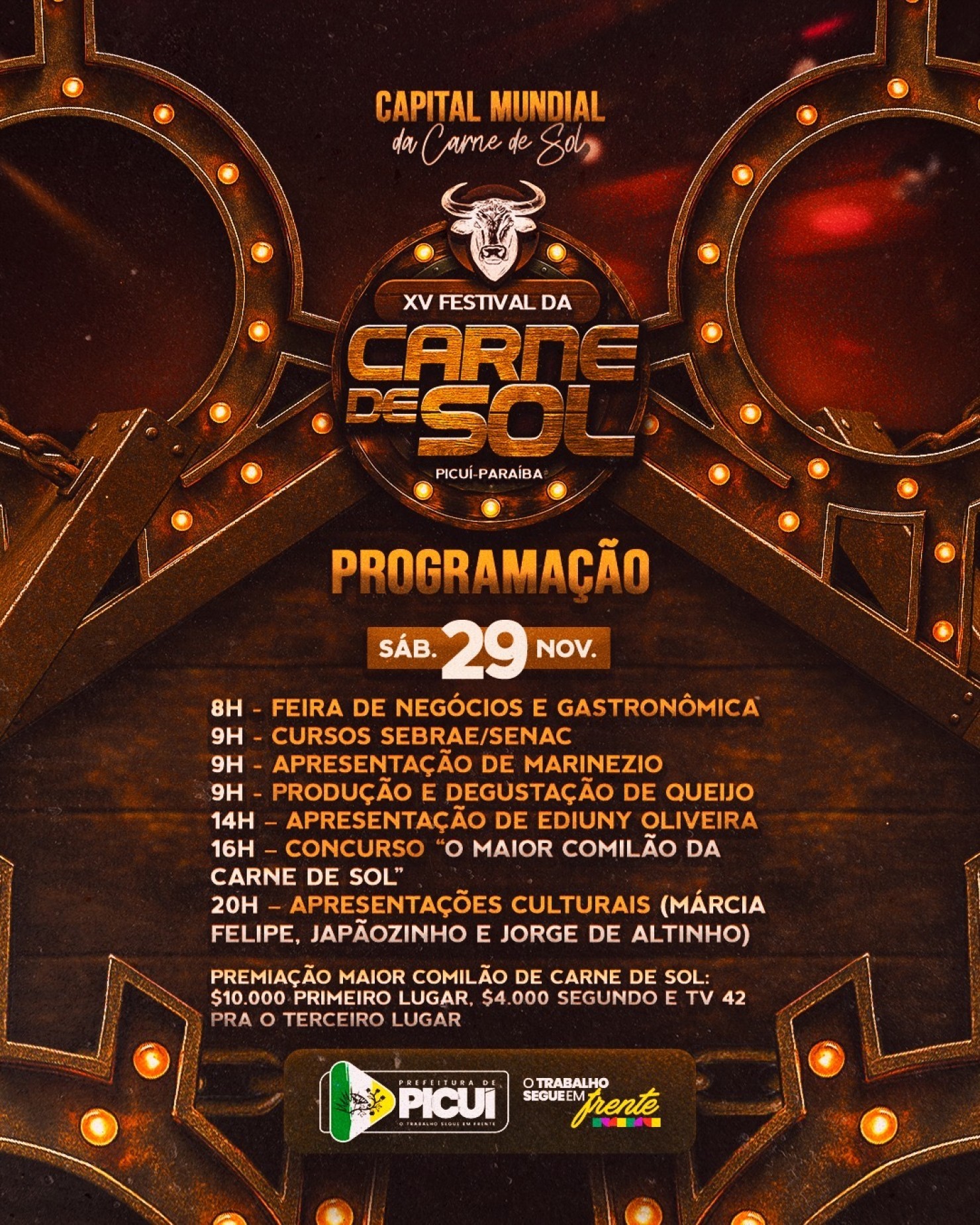 O festival, promovido pela Prefeitura de Picuí, celebra a força econômica e cultural do município, reconhecido nacionalmente por sua produção de carne de sol. A edição deste ano promete ser uma das maiores já realizadas.
