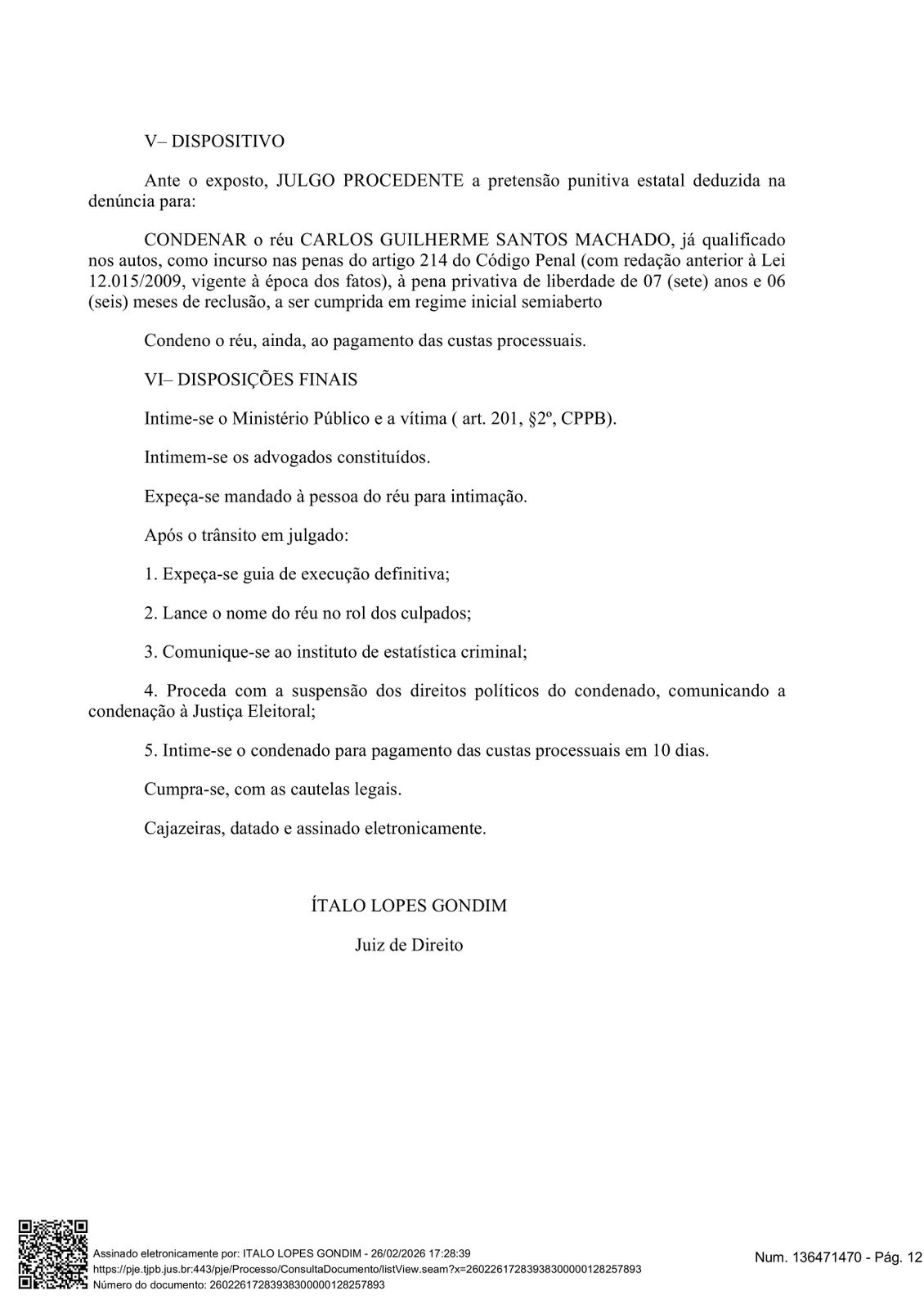 A Justiça da Paraíba condenou o ex-promotor de Justiça Carlos Guilherme Santos Machado a 7 anos e 6 meses de reclusão, em regime inicial semiaberto, pelo crime de atentado violento ao pudor. A sentença, assinada pelo juiz Ítalo Lopes Gondim, refere-se a fatos ocorridos em 5 de abril de 2009, na cidade de Cajazeiras.