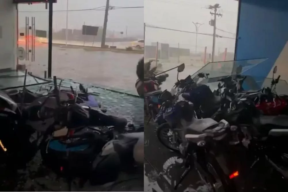 Um dos registros mostra o interior da concessionária Yamaha Socel Motos, às margens da BR-230. A força do vento arrancou portas de vidro, derrubou motocicletas expostas na vitrine e provocou a interrupção no fornecimento de energia elétrica. Funcionários relataram momentos de desespero durante o temporal.