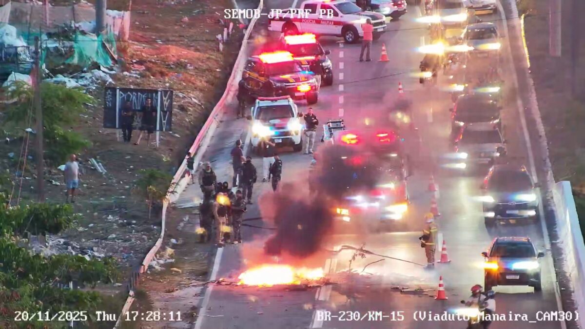O bloqueio foi feito próximo ao viaduto que passa sobre a avenida Flávio Ribeiro Coutinho (Retão de Manaíra). no km 15 da Br-230, no sentido João Pessoa – Cabedelo.