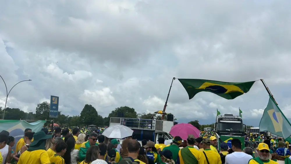A concentração para a manifestação ocorreu na Praça do Cruzeiro e contou com a presença de Carlos e Michelle Bolsonaro, além de parlamentares como Gustavo Gayer (PL), André Fernandes (PL), Pablo Almeida (PL) e Cristiano Caporezzo (PL).
