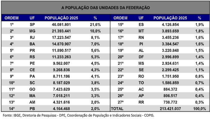 O estudo apresenta estimativas para o contingente populacional e a taxa de crescimento de todos os municípios do país para 2025, bem como para todas as unidades da federação, regiões metropolitanas e regiões integradas de desenvolvimento.